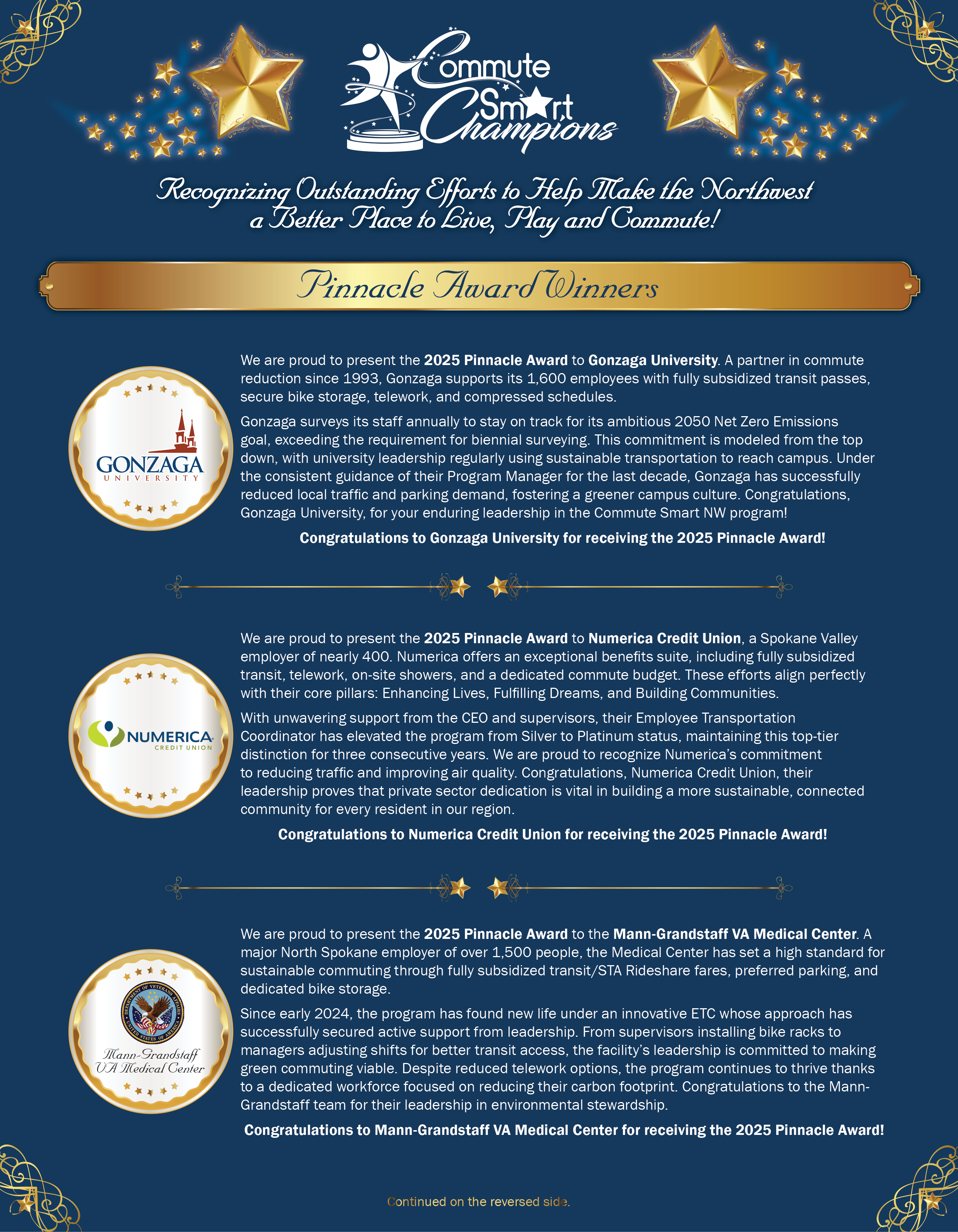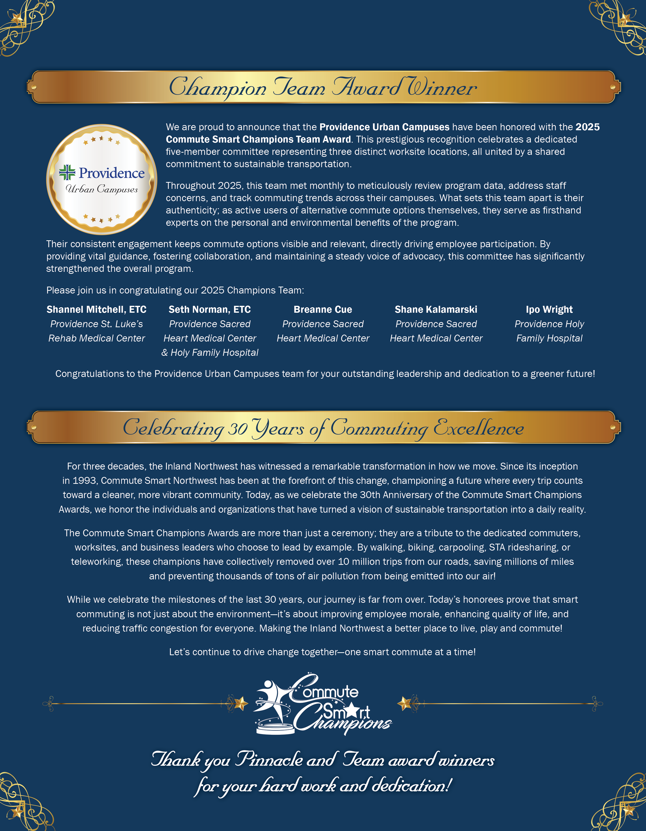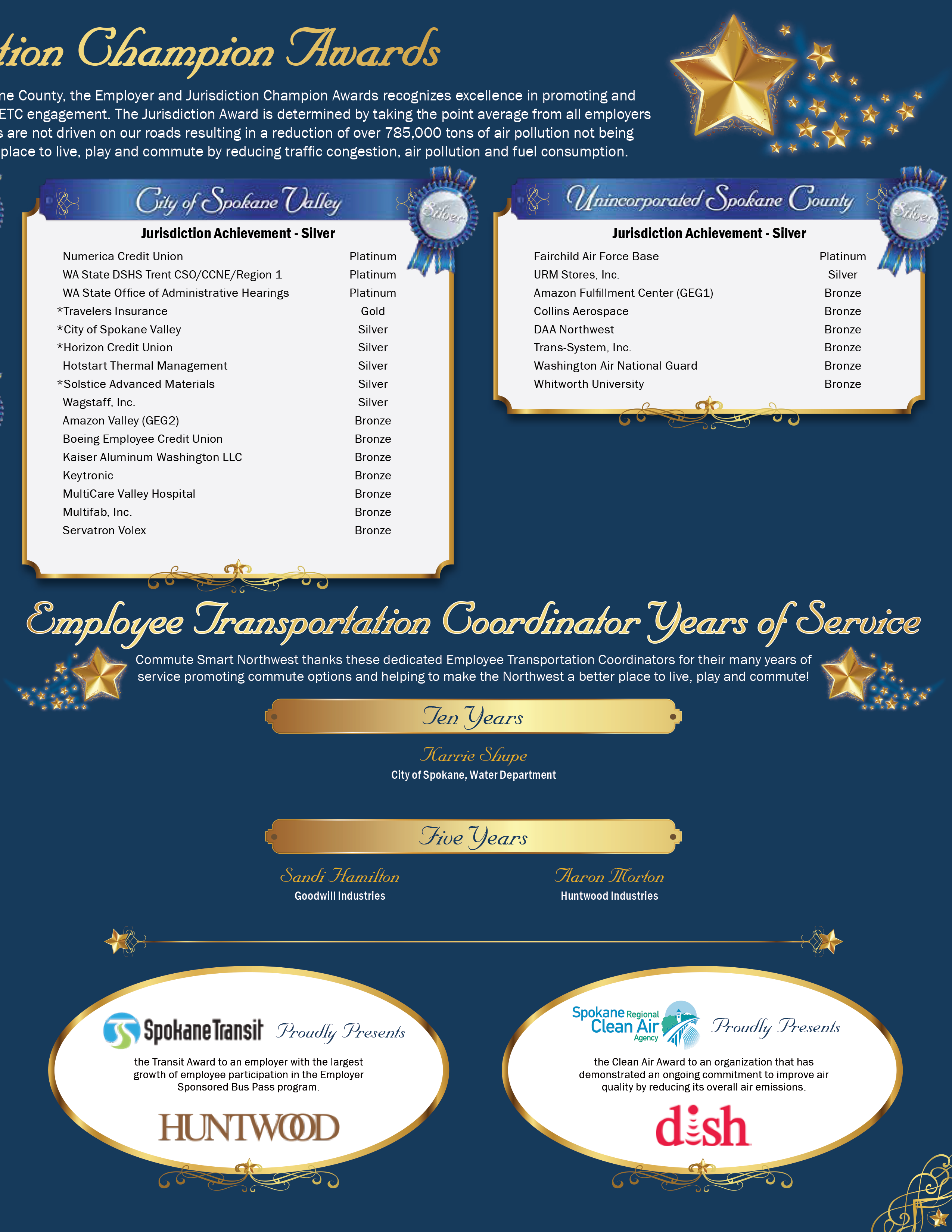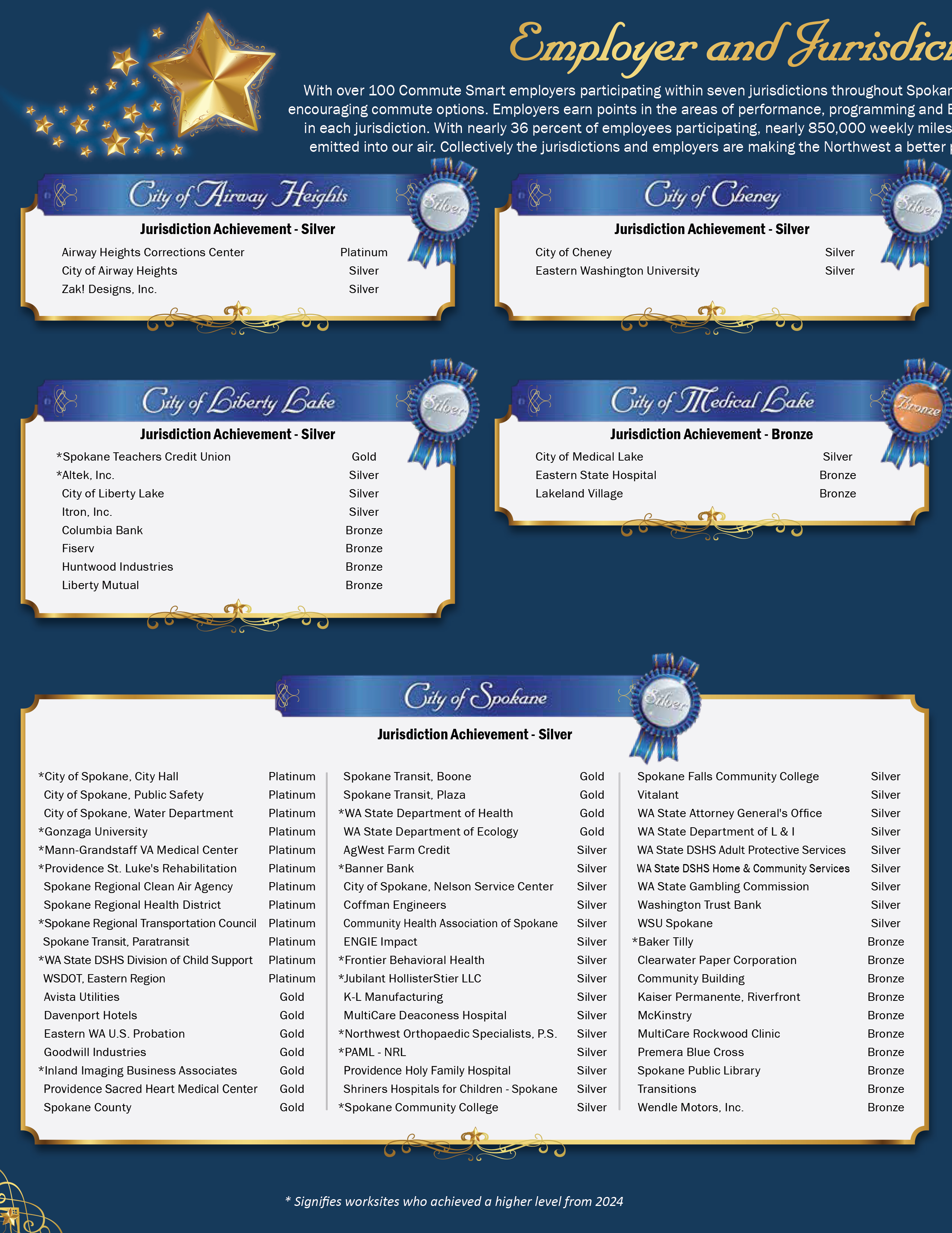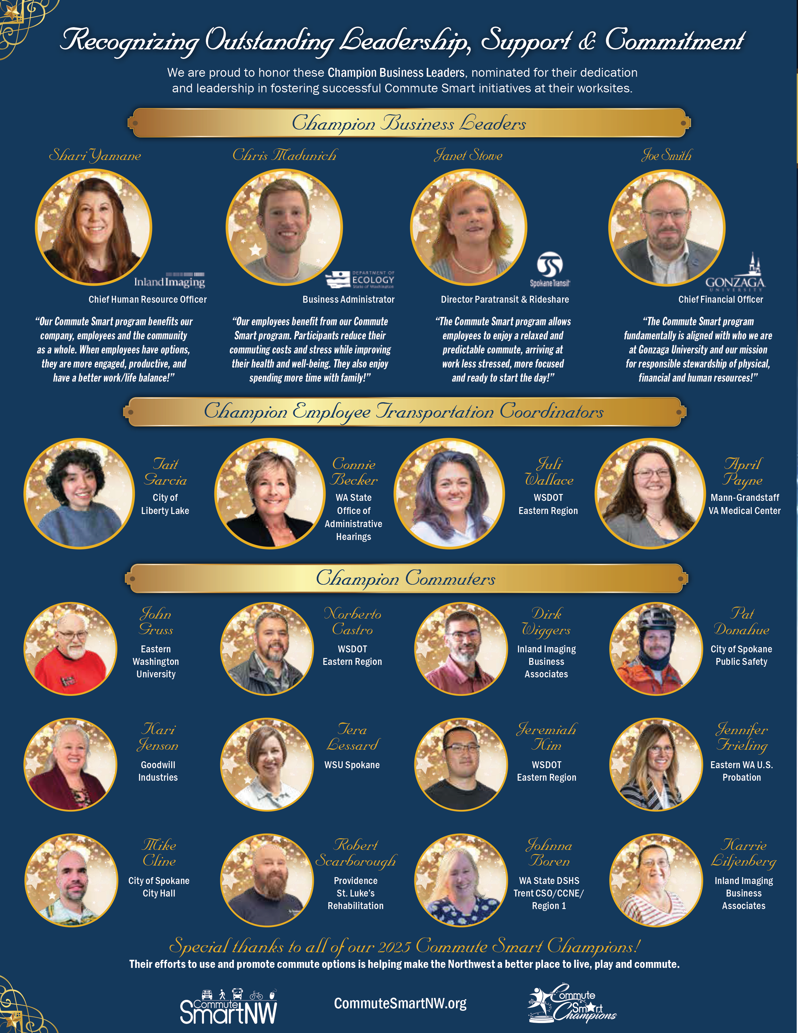 Commute Smart Northwest works with over 100 employers in Spokane County to promote and encourage employees to use commute options including riding the bus, carpooling, STA Ridesharing, walking, bicycling, and working from home. With nearly 36 percent of employees participating, nearly 850,000 weekly miles are not driven on our roads resulting in a reduction of over 785,000 tons of air pollution not being emitted into our air. The following Champion Business Leaders were honored in 2025 for their exceptional efforts to make their Commute Smart programs a success at their worksites. |