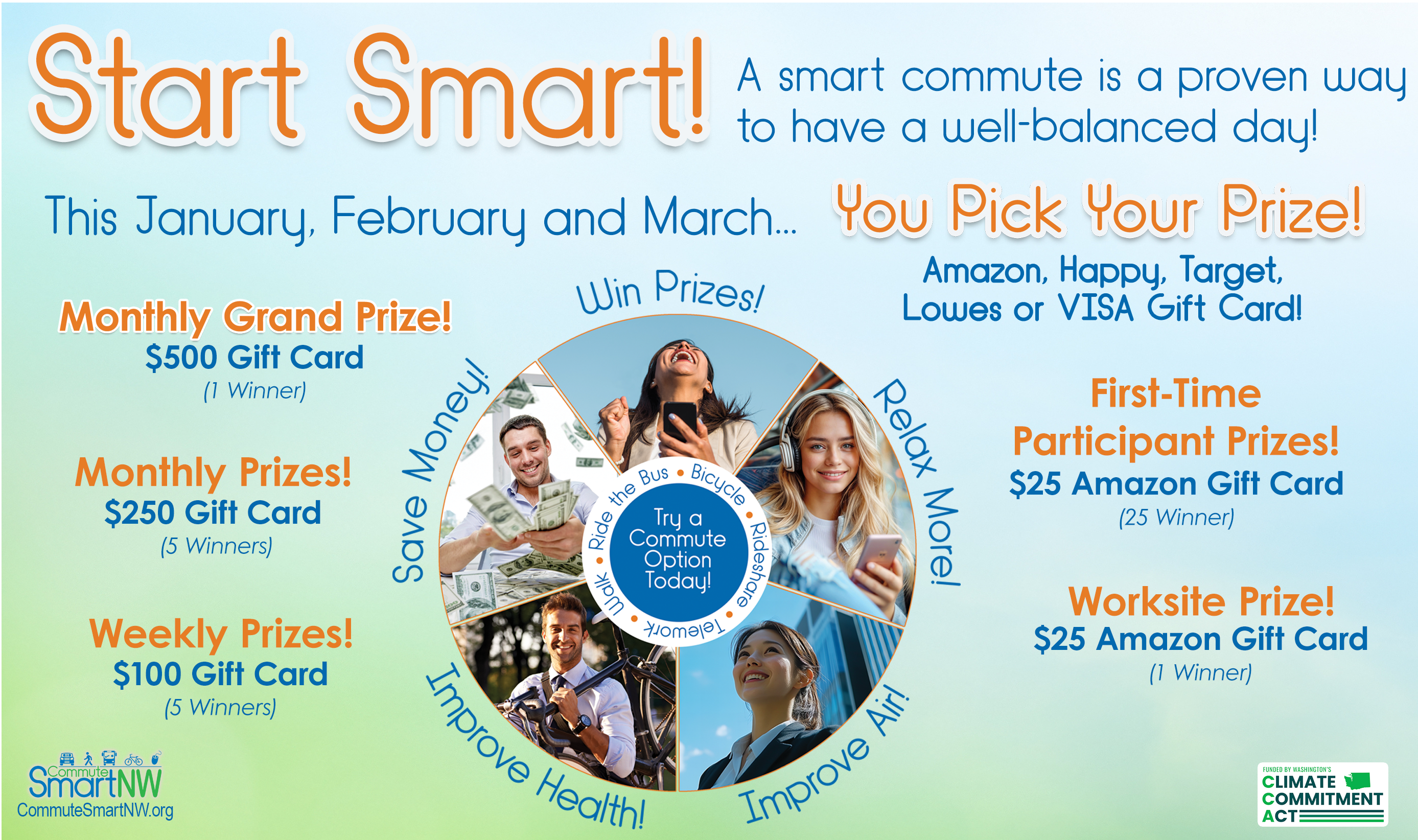 Start the New Year off right, Start Smart by choosing a commute option over that boring drive-alone commute. You'll love all the perks, and by participating, you could WIN and pick your own prize! Click to learn more! |